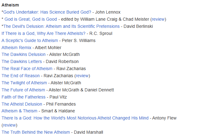 I wanted to show you what was on it, link to debunks of those books if they exist, and then give some better resources to anybody–including Christians and especially including fundagelicals–who wants to learn about atheism from the people most qualified to speak on the subject: actual atheists.