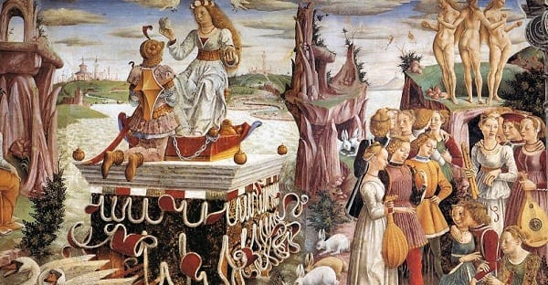 (Francesco del Cossa, Wikipedia. 15th-century fresco called “Triumph of Venus” or “Allegory of April.” That’s Mars and Venus on the left, the Three Graces at the upper right, and ALL THE LUSCIOUS COSTUMES on the lower right on the playful youths.