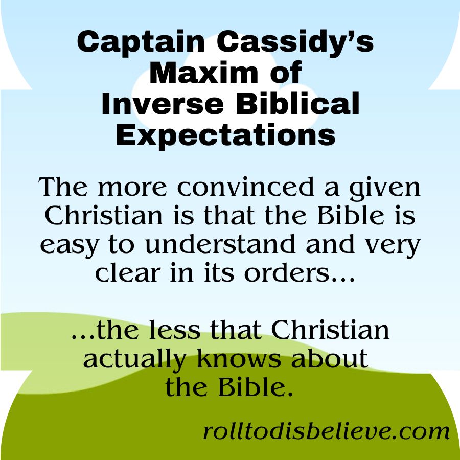 (Captain Cassidy’s Maxim of Inverse Biblical Expectations: The more convinced a given Christian is that the Bible is super-easy to understand and very clear in its orders, the less that Christian actually knows about the Bible.)