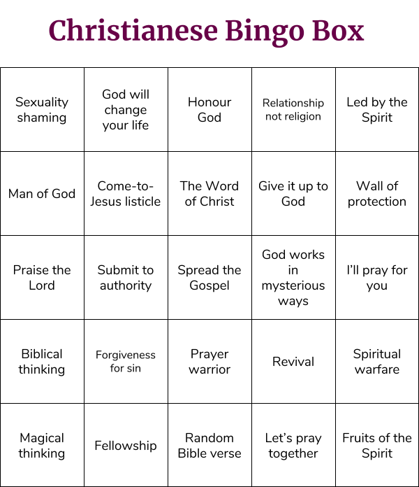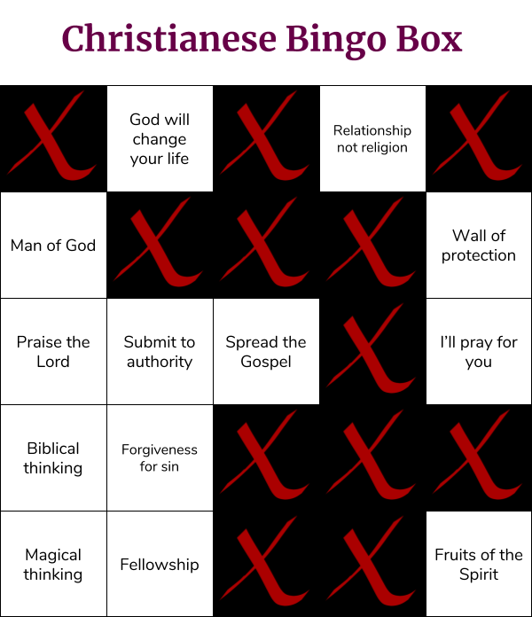 I’ll be taking a drink every time I fill in a square on the Christianese Bingo Box. You can find it below if you want to play along.