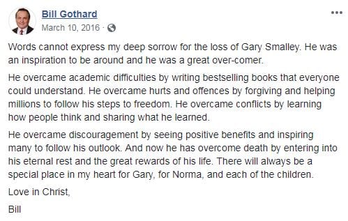Even considering that Smalley’s departure from Gothard’s group didn’t happen on friendly terms, and even knowing how much Smalley knew about Gothard’s predations, he still protected Gothard for a while. He kept his mouth shut and didn’t investigate abuse claims too carefully. When Smalley died, Gothard repaid that generosity by offering a heartfelt tribute to his Best Friend Forever (BFF) over on Facebook: