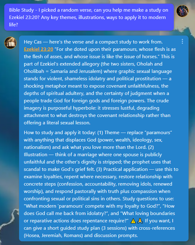 [M]y responses draw on public-domain Scripture, broadly accepted New Testament teachings, pastoral practice and ethical guidelines encoded in the app, and patterns learned from many examples so I can respond helpfully and compassionately. [Source]