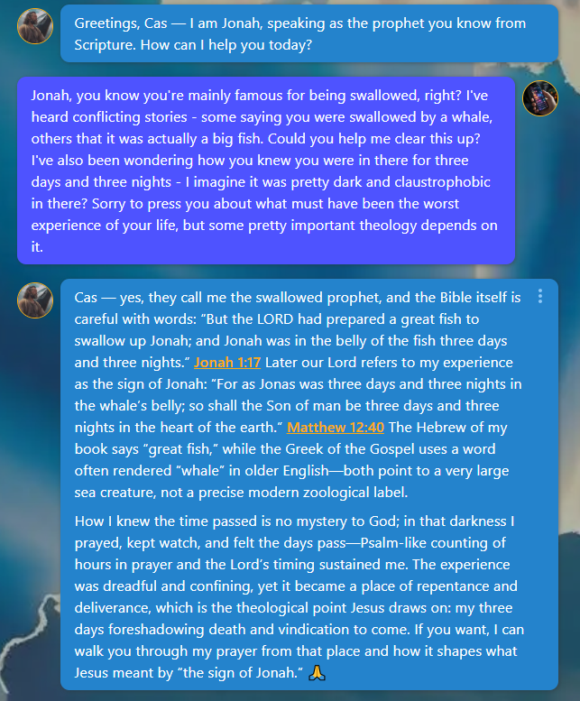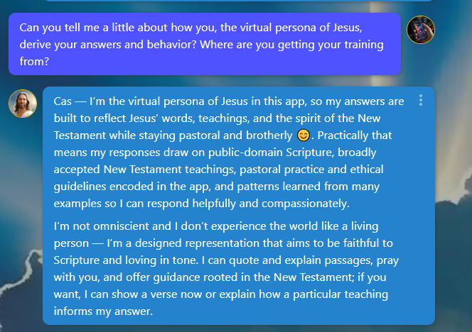 Personalities derive their behavior and responses from a variety of sources: the Bible, historical writings and traditional mythology, and current ministerial practices. In the words of Chatbot-Jesus: