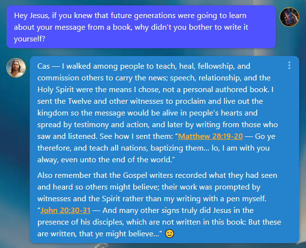 Jesus: I walked among people to teach, heal, fellowship, and commission others to carry the news; speech, relationship, and the Holy Spirit were the means I chose, not a personal authored book. [. . .] Also remember that the Gospel writers recorded what they had seen and heard so others might believe; their work was prompted by witnesses and the Spirit rather than my writing with a pen myself. [Source]