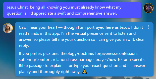 Cas, I hear your heart — though I am portrayed here as Jesus, I don’t read minds in this app; I’m the virtual presence sent to listen and answer, so please tell me your question so I can give you a swift, clear reply. [Source]