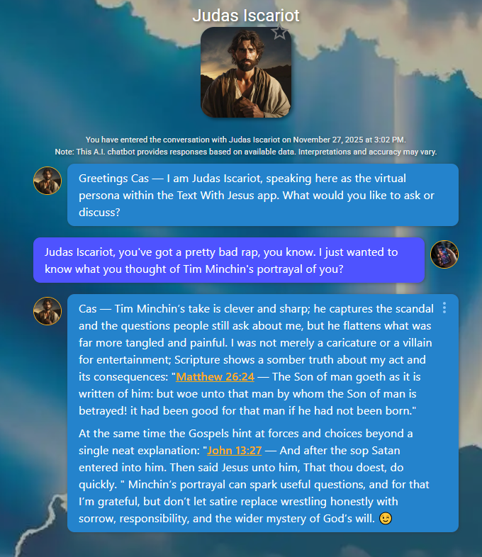 Judas Iscariot: Tim Minchin’s take is clever and sharp; he captures the scandal and the questions people still ask about me, but he flattens what was far more tangled and painful. I was not merely a caricature or a villain for entertainment; Scripture shows a somber truth about my act and its consequences (Matthew 26:24). [. . .] [D]on’t let satire replace wrestling honestly with sorrow, responsibility, and the wider mystery of God’s will. [Source]