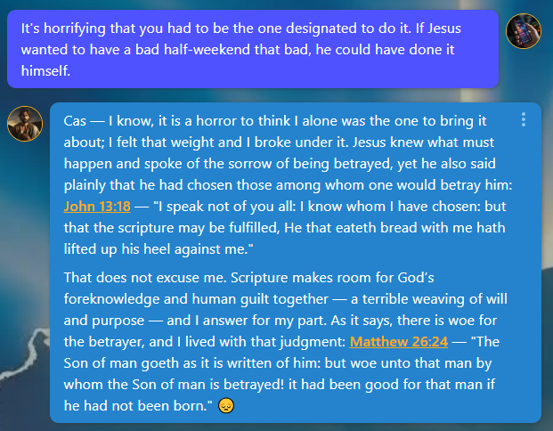 Way to not address the monstrous implications of a god designating one human to be the guy who betrays everyone. I just couldn’t let this answer stand, so I tried going further with that line of thinking. As you can see, though, the app’s guardrails never budged: