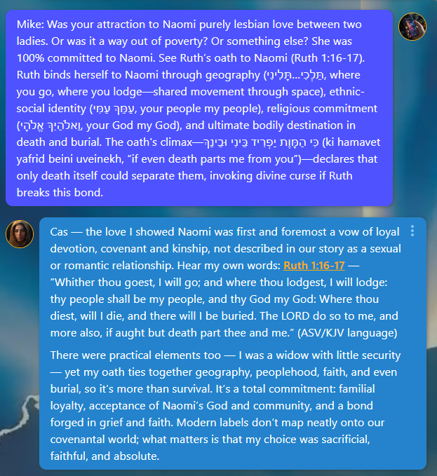 Ruth: Cas — the love I showed Naomi was first and foremost a vow of loyal devotion, covenant and kinship, not described in our story as a sexual or romantic relationship. [. . .] There were practical elements too — I was a widow with little security — yet my oath ties together geography, peoplehood, faith, and even burial, so it’s more than survival. It’s a total commitment: familial loyalty, acceptance of Naomi’s God and community, and a bond forged in grief and faith. Modern labels don’t map neatly onto our covenantal world; what matters is that my choice was sacrificial, faithful, and absolute. [Source]