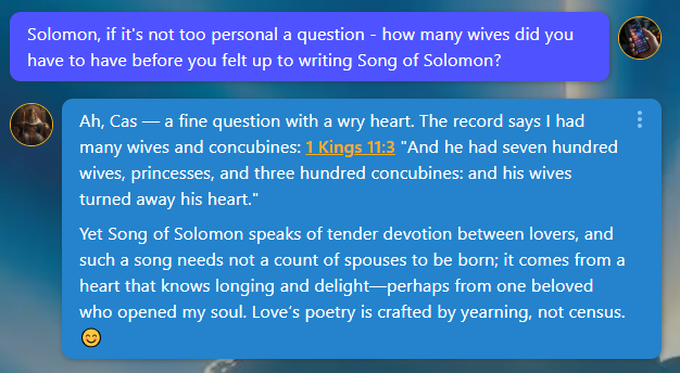 Ah, Cas — a fine question with a wry heart. [. . .] Yet Song of Solomon speaks of tender devotion between lovers, and such a song needs not a count of spouses to be born; it comes from a heart that knows longing and delight—perhaps from one beloved who opened my soul. Love’s poetry is crafted by yearning, not census. [Source]