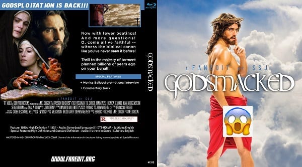 Hi, folks! Today we have ssj back for the third installment of his most excellent fan edit of Godsmacked. Enjoy! Today, the Holy Trinity gets fleshed out, Jesus takes less than full advantage of a brief family reunion, Pilate seems to get the upper hand, and Simon of Cyrene lends a hand. (Mini-Me demon not included.) Equipped with editing software and sacrilegious tendencies, ssj rewrote Mel Gibson’s brutal love letter to Jesus with less blood and more lulz.