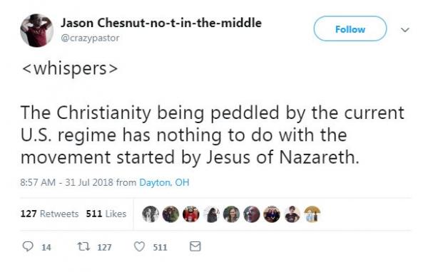 In the wake of Donald Trump’s ascension to power, I’ve been seeing more of this nonsense. Last summer, I caught one of those hipster-type Christians spouting this tedious, self-important blather: