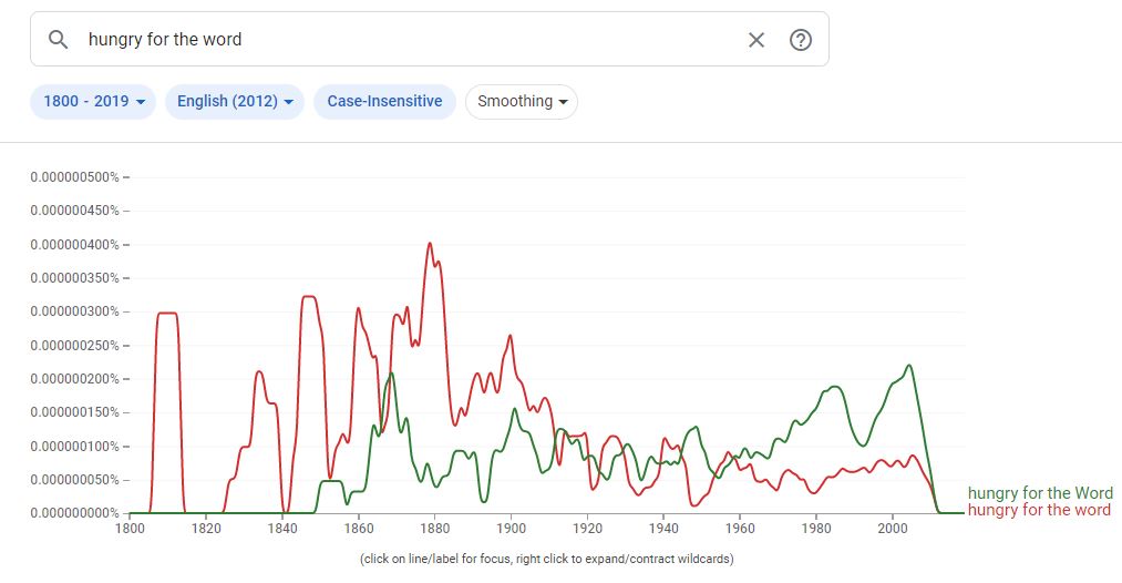 Google Ngram viewer for phrase hungry for the word. Red is uncapitalized ‘word,” while green is capitalized.